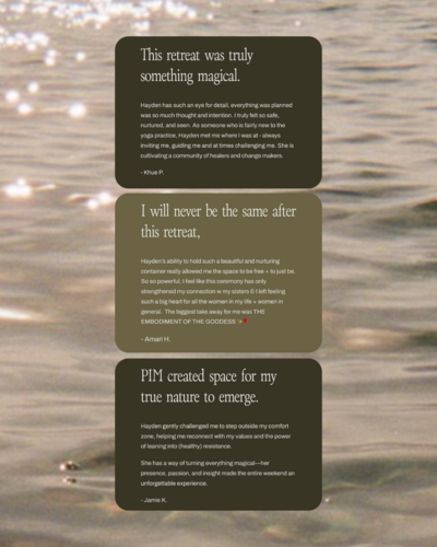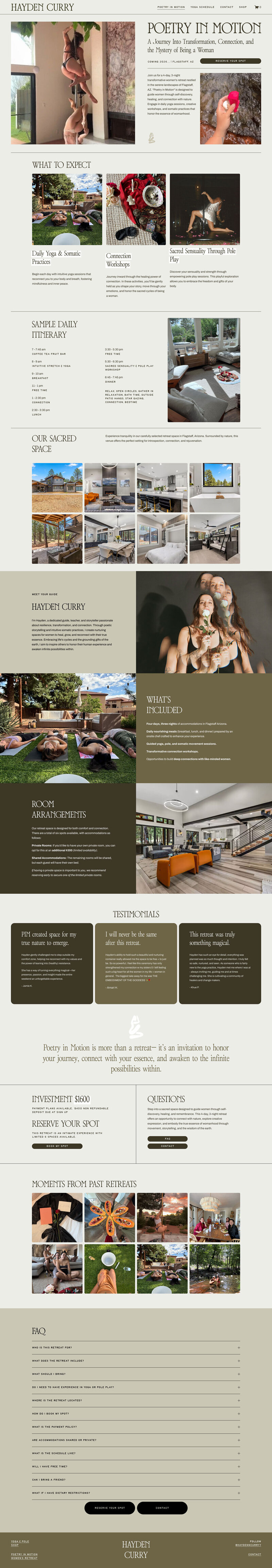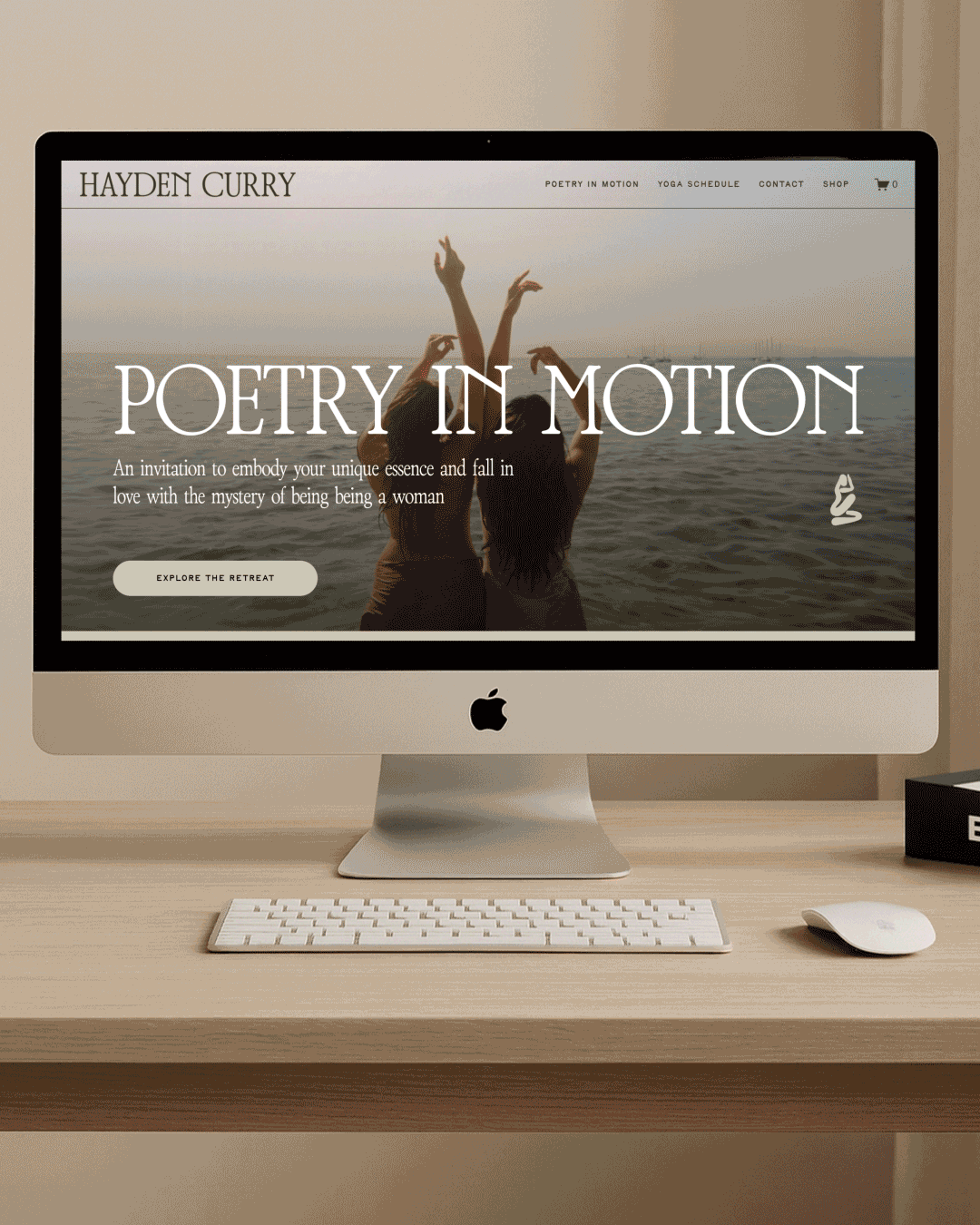 For Hayden Curry, I created a full branding and website package that brought her vision to life with both her personal brand and her flagship women’s retreat, Poetry in Motion. This included a complete logo suite, typography system, and custom color palette, as well as Instagram templates and brand guidelines to ensure consistency across platforms. I designed and developed a multi-functional website that highlights her retreat offerings with a templated landing page, integrates her poetry book as a product for sale, and shares her yoga schedule in a clear, accessible way. The site was built to feel warm, intentional, and aligned with her mission—inviting visitors to connect with her through storytelling, movement, and the grounding power of nature.